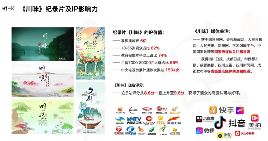 《川味》是国内首部聚焦川味文化的大型系列纪录片,自第一季播出以来,已成为向世界展示中国饮食文化的重要窗口。前四季核心成果:全网累计播放量突破 5 亿,全球累计超过 40 + 电视及网络媒体播映,覆盖国内主流视频平台及海外 YouTube、Netflix 等渠道,被翻译成英语、日语、蒙古语、柬埔寨语、老挝语、以及非洲东部地区多国等多语种发行。让全球观众通过川味读懂中国乡土社会的情感与智慧。文化意义:系列纪录片不仅记录了川菜的技艺与风味,更挖掘了其背后的历史变迁、民俗传统与匠人精神,成为川味文化的 “影像档案”与传播名片。